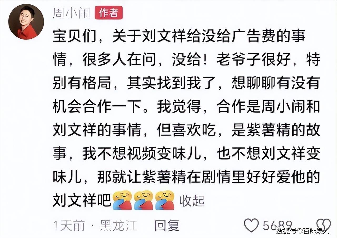 为此,周小闹还特地注释,声称对方有找他谈过合做,此前未收取告白费,最初他了合做邀约,强调“爱吃是紫薯精的故事,合做是周小闹的事”。